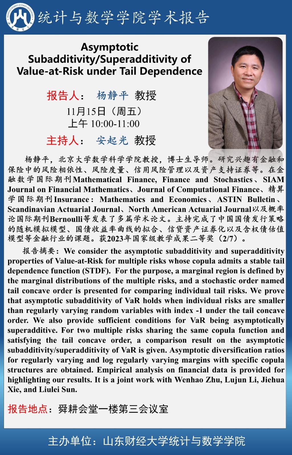 十大体育网站学术预告—Asymptotic Subadditivity/Superadditivity of Value-at-Risk under Tail Dependence