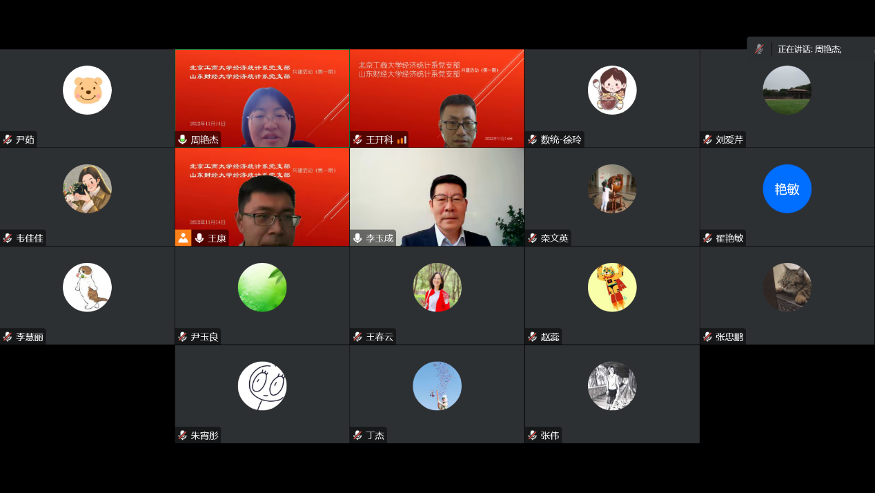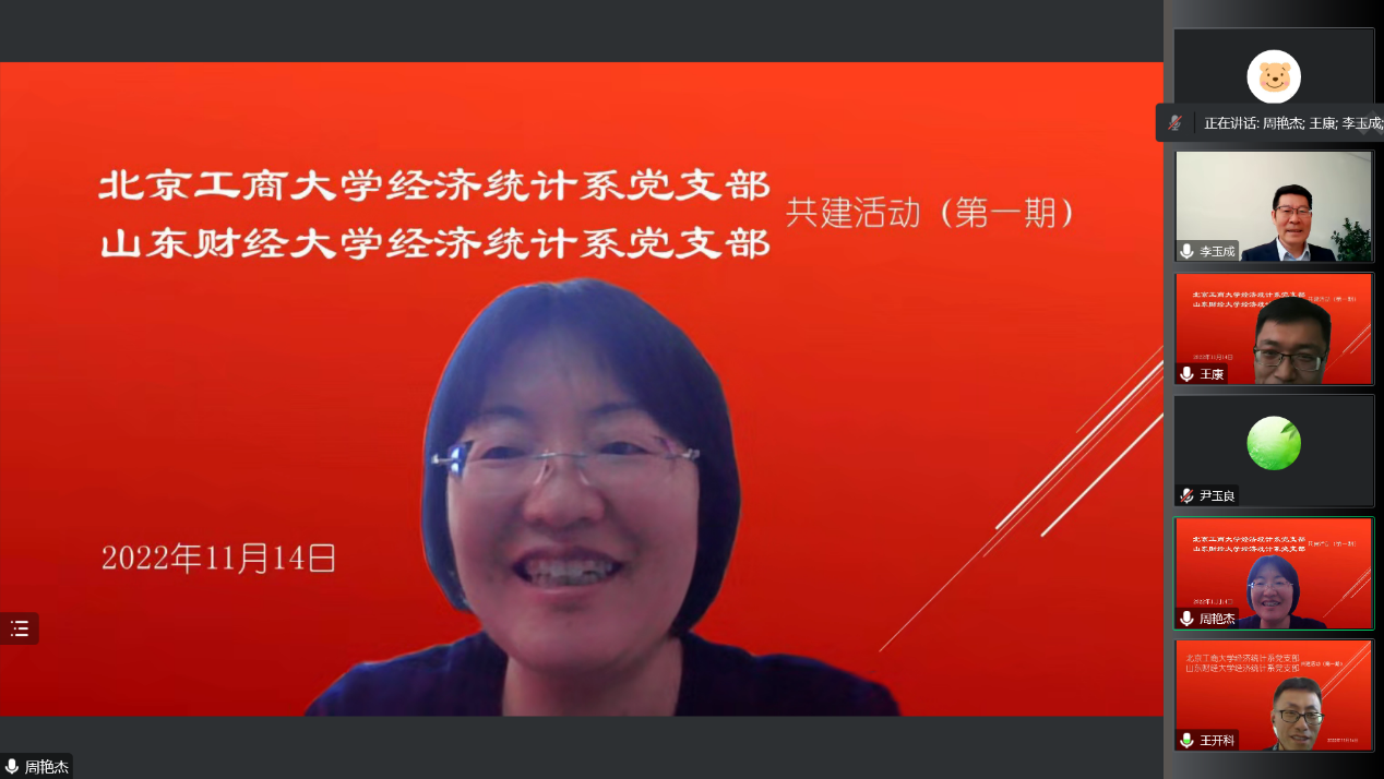 公司党委书记李玉成、北京工商大学数学与统计公司党委书记周艳杰,以及两校经济统计系支部的党员教师和部分研究生代表参加线上交流,活动由北京工商大学经济统计系主任王康主持。
