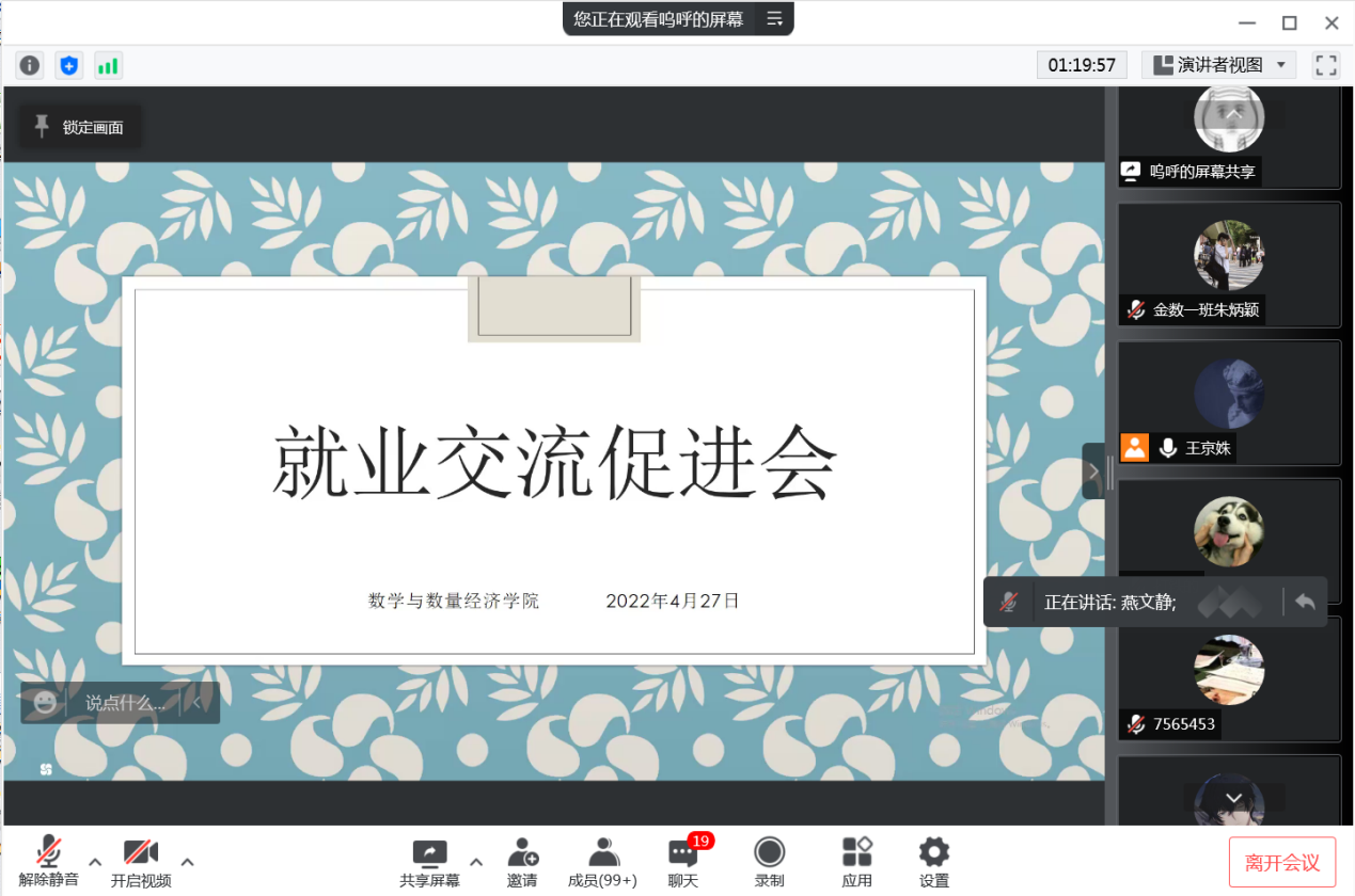 4月27日下午,2018级毕业生就业交流促进会在线上召开。公司毕业班辅导员王京姝、就业办主任燕文静及2018级金融数学、数学与应用数学专业全体同学参加会议。会议开始前,公司通过多种方式,对毕业生目前面临的主要问题和思想动态做了调研,力图通过本次会议有针对性地解决就业实际问题,推动高质量就业。