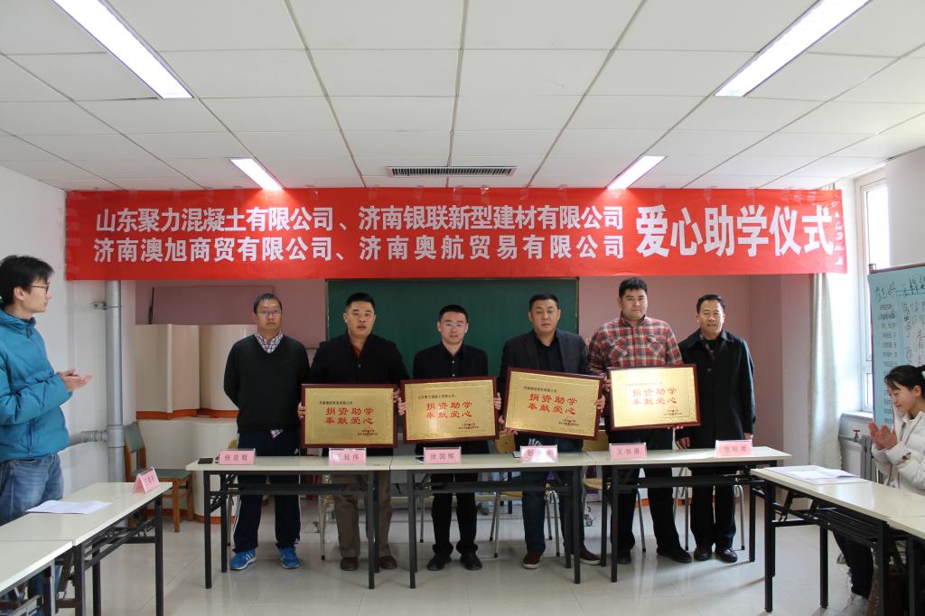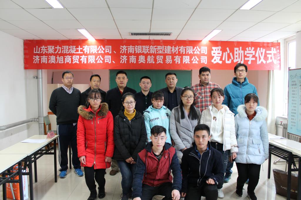 12月12日上午,聚力商砼助学金捐助仪式在圣井校区举行,聚力混凝土有限公司总经理徐国辉、济南银联新型建材有限公司总经理贾相帅、济南奥航贸易有限公司总经理王延伟、济南澳旭商贸有限公司总经理王书勇、公司党委副书记赵连幸,团委书记王昊天、党委秘书张亚萌和全体受助员工及班级干部参加了活动。