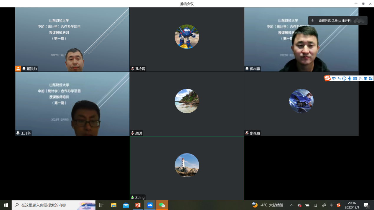 为进一步规范中加(统计学)合作办学,打造专业化、国际化、高水平的教师队伍,公司于12月2日通过腾讯会议在线举办了中加(统计学)项目第一次团队培训会。副经理王开科、数理统计系主任孔令涛,以及中加(统计学)专业部分中方授课教师、外方授课教师Zhang Jing、Yan Yuan及管理人员参加。会议由数理统计系戴洪帅教授主持。