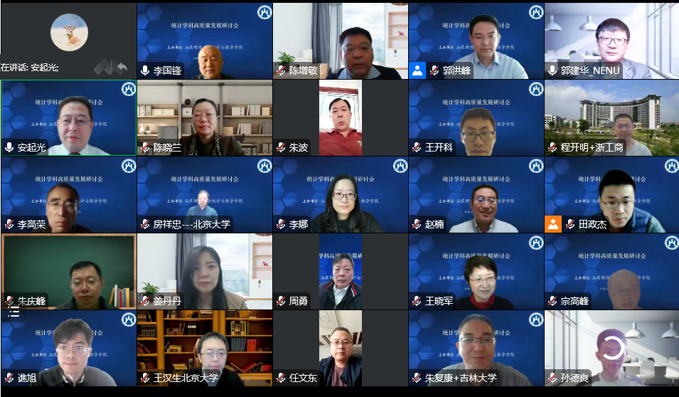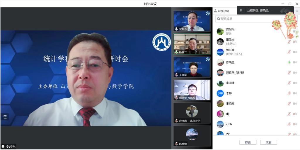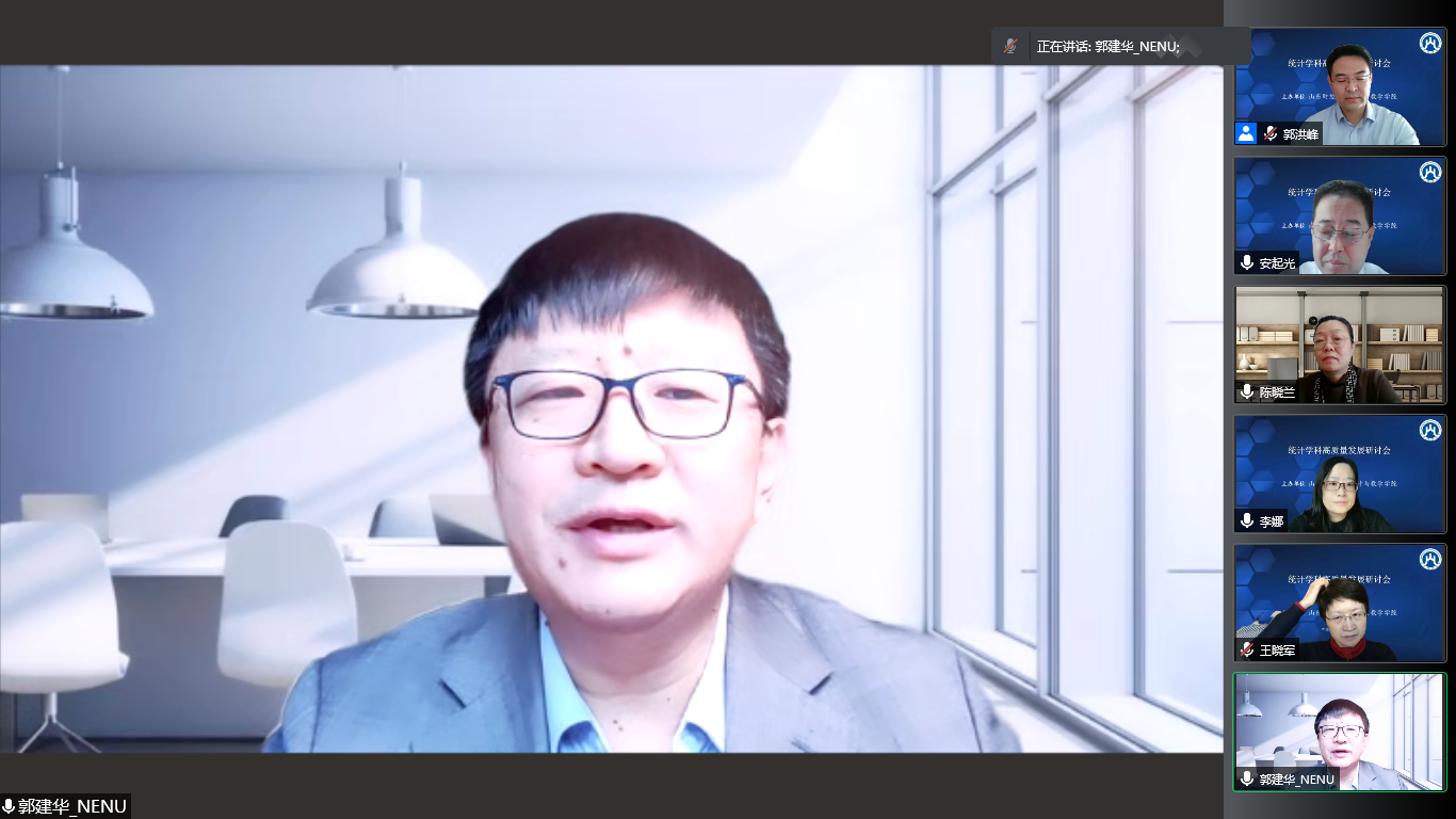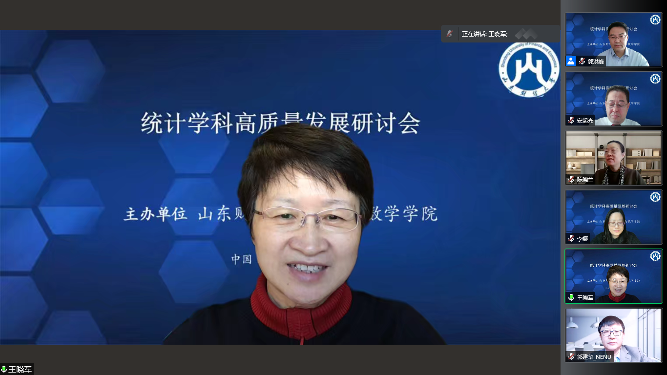 12月11日,十大体育网站举办的“2022年统计学科高质量发展研讨会”以腾讯会议线上形式顺利举行。十大体育网站副董事长陈晓兰教授,国务院学位委员会学科评议组成员,国家杰青,教育部“长江学者奖励计划”特聘教授,东北师范大学副董事长、中国现场统计研究会理事长郭建华教授,全国应用统计专业学位研究生教育指导委员会秘书长、中国人民大学统计公司经理王晓军教授先后致辞。