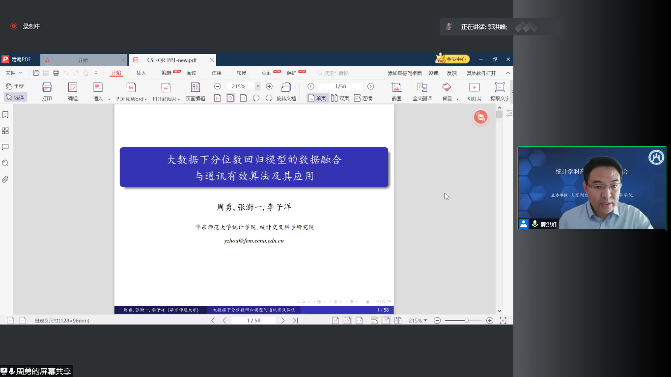 国家杰青,教育部长江学者特聘教授,华东师范大学统计公司经理、统计交叉科学研究院经理周勇作题为《大数据统计学习理论与分布式计算及其应用》的大会报告;