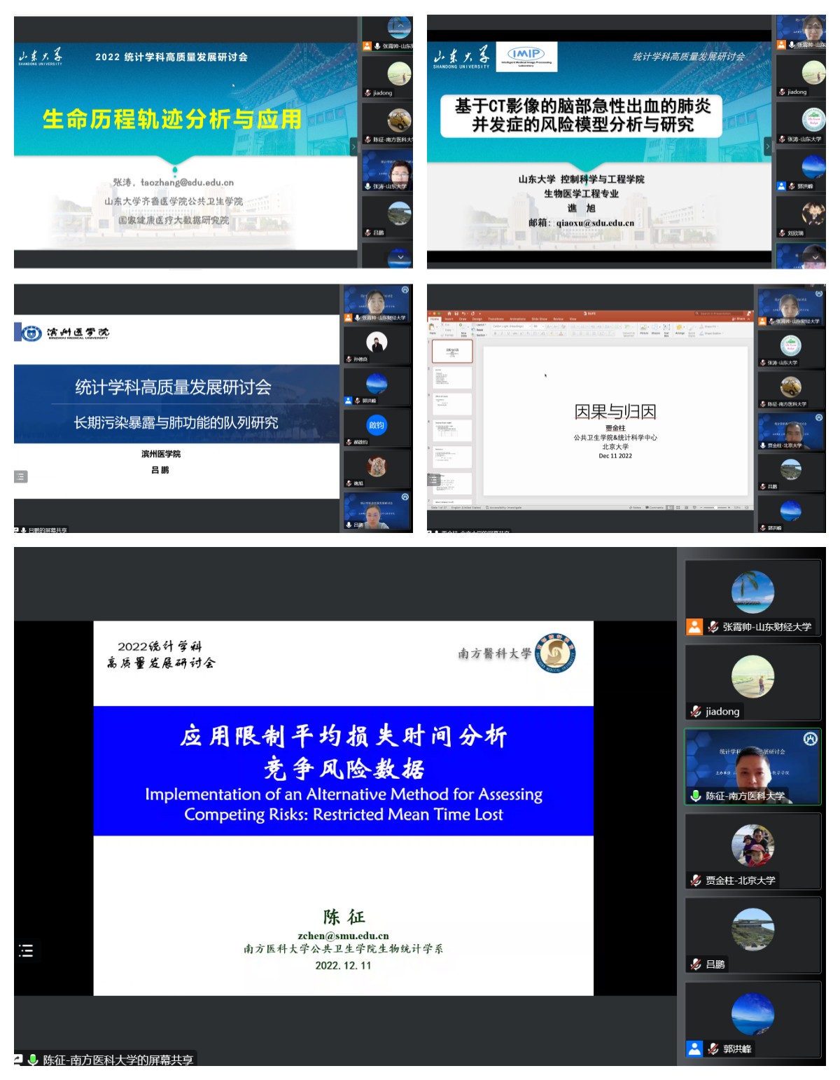 生物医学统计分组报告:北京大学公共卫生公司教授、博导贾金柱《因果推断与归因分析》;南方医科大学公共卫生公司教授、博导陈征《Implementation of an Alternative Method for Asessing Competing Risks: Restricted Mean Time Lost》;山东大学公共卫生公司教授、博导张涛《生命历程轨迹分析方法与应用》;山东大学副教授,硕导谯旭《基于CT影像的脑部急性出血的肺炎并发症的风险模型分析与研究》;滨州医公司公共卫生公司教授,硕导吕鹏《Associations between long-term air pollutants exposure and lung function in Chinese young adults》。