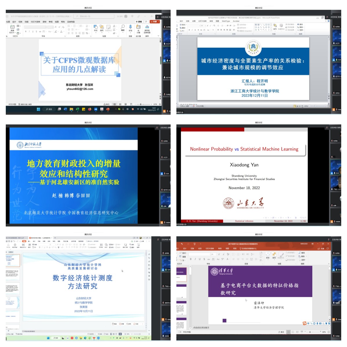 经济统计分组报告:东北财经大学统计公司教授、博士生导师、副经理,国家社科基金重大项目首席专家孙玉环《关于CFPS 微观数据库应用的几点解读》; 浙江工商大学统计 与数学公司教授、博士生导师,经理,国家社科基金重大项目首席专家程开明《城市经济密度与全要素生产率的关 系验:兼论城市规模的调节效应》;北京师范大学统计公司、教授、博士生导师副经理赵楠《地方教育财政投入的增量和结构性 研究——基于河北雄安新区的准自然实验》;山东大学金融研究院副研究员严晓东《非线性期望与统计机器学习》;十大体育网站博士、预聘副教授张美慧《数字经济统计测度方法研究; 清华大学经济管理公司助理研究员雷泽坤《基于电商平台大数据的特征价格指数研究》。