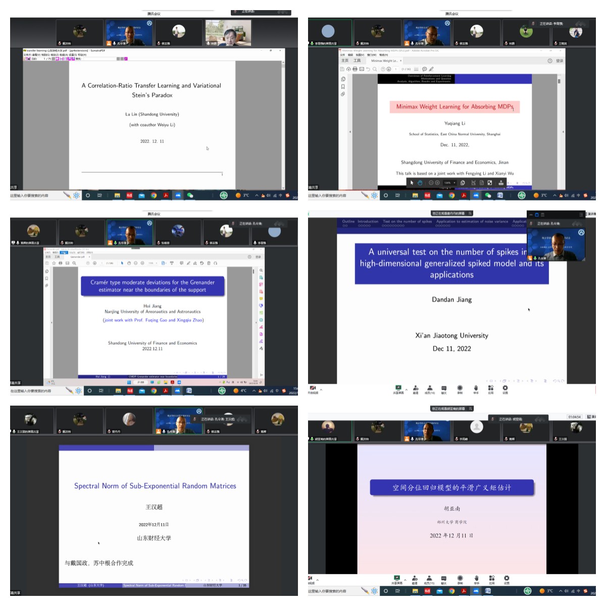 数理统计分组报告:山东大学教授、博士生导师林路《A Correlation-Ratio Transfer Learning and Variational Stein's Paradox》;华东师范大学教授、博士生导师李育强《Minimax Weight Learning for Absorbing MDPs》;南京航空航天大学教授、博士生导师蒋辉《Cramer type moderate deviations for Grenander estimator near boundaries of the support》;西安交通大学教授、博士生导师姜丹丹《A universal test on the number of spikes in a high-dimensional generalized spiked model》;山东大学教授、博士生导师王汉超《Tail Bounds on the Spectral Norm of Sub-Exponential Random Matrices》;郑州大学商公司副教授胡亚南《空间分位回归模型的平滑广义矩估计》。