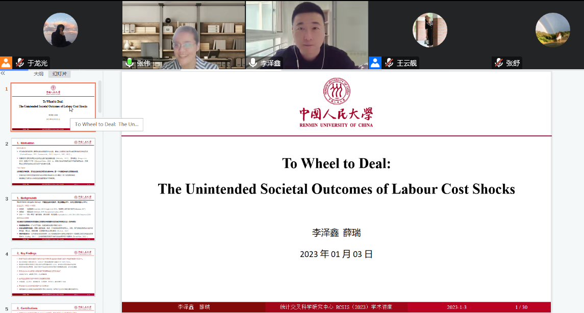 1月3日下午,统计交叉科学研究中心(RCSIS)2023年系列学术讲座第1讲在“云”端顺利开讲。中国人民大学国家发展与战略研究院博士后李泽鑫研究员应邀做客本次学术讲座,并做了主题为“To Wheel to Deal: The Unintended Societal Outcomes of Labour Cost Shocks”的学术报告。本次讲座由十大体育网站博士生导师张伟教授主持,近百名老师、硕博士研究生参加了本次讲座。