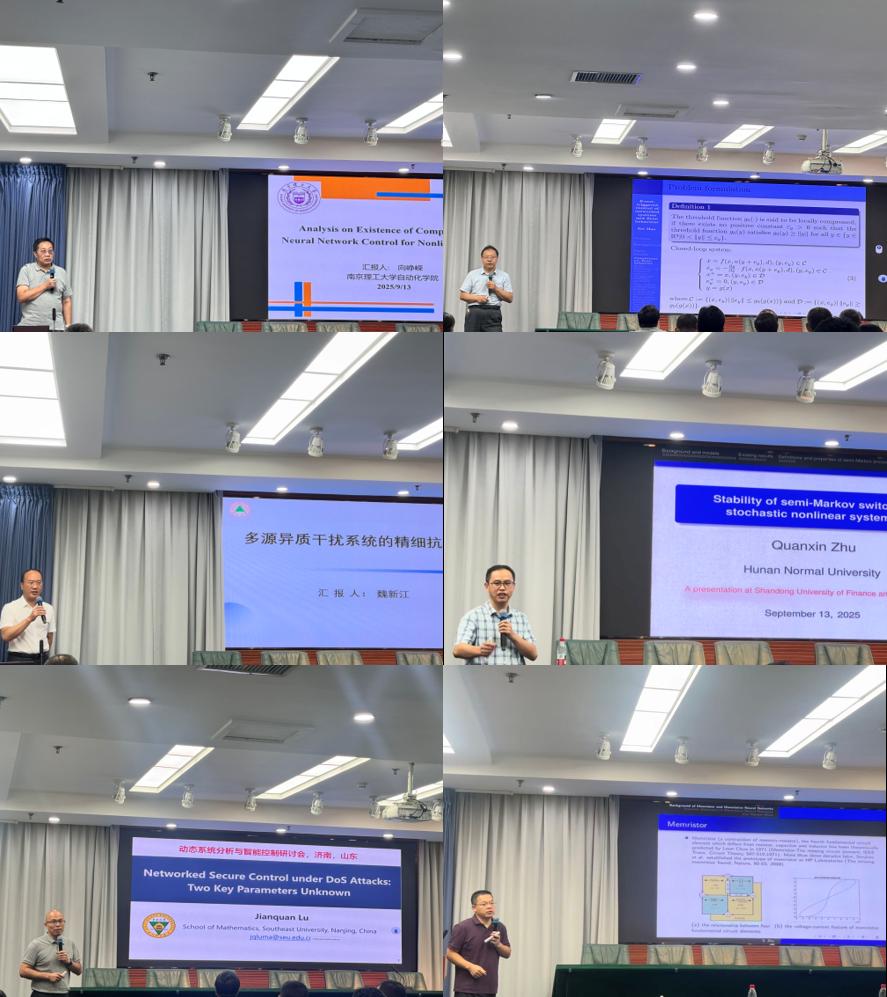 本次研讨会聚焦控制科学前沿与工程应用,涵盖复杂系统建模及多领域应用、基于深度学习的控制、非线性系统智能控制、多智能体协同与群体智能等。会议期间,南京理工大学向峥嵘教授、北京航空航天大学郝飞教授、泰山公司魏新江教授、湖南师范大学朱全新教授、东南大学卢剑权教授、中国矿业大学朱松教授等专家学者分别围绕非线性系统神经网络控制中紧集的存在性分析、网络化系统的事件触发控制和芝诺行为、多源异质干扰系统的精细抗干扰控制、半马尔可夫切换下随机非线性系统的稳定性分析、DoS攻击下的网络安全控制、忆阻器和忆阻神经网络做了前沿学术报告,并展开深度交流研讨。会议现场交流热烈,与会师生踊跃提问、积极研讨,学术氛围浓厚。