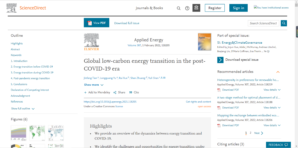 近日,统计公司田金方教授以第一作者在国际能源领域顶级学术期刊《Applied Energy》2022年第307卷上发表题为“Global low-carbon energy transition in the post-COVID-19 era”的论文(DOI:10.1016/j.apenergy.2021.118205)。Applied Energy同时位于JCR和中科院国际SCI期刊的Q1分区,最新影响因子为9.746,系公司A1类期刊。