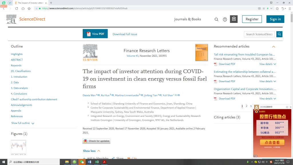 统计公司青年教师万道侠博士与田金方教授及其合作者的论文《The impact of investor attention during COVID-19 on investment in clean energy versus fossil fuel firms》在期刊《Finance Research Letters》发表(2021年11月)。该期刊为经济学领域SSCI一区期刊,2020年影响因子为5.596,属公司A1类期刊。