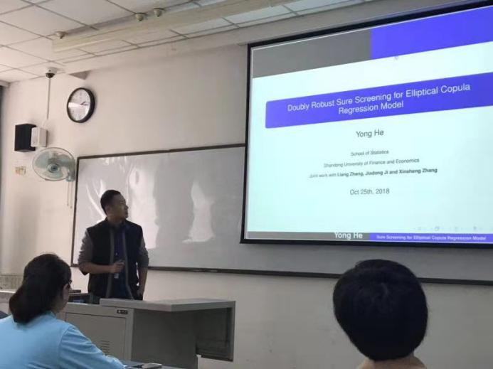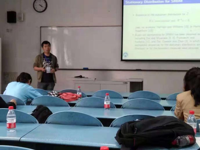 公司派出数理统计系的戴洪帅、何勇、季加东、于渊、孔令涛、郝涛等六位教师代表参加了此次会议。会议期间,戴洪帅老师做了题为“Stationary Distributions for Two-Dimensional Sticky Brownian Motion: Exact Tail Asymptotics and Extreme Value Distributions”的报告,何勇老师做了题为“Doubly Robust Sure Screening for Elliptical Copula Regression Model”的报告,季加东老师做了题为“A New Insight into Underlying Disease Mechanism Through Semi-parametric Latent Differential Network Model”的报告。