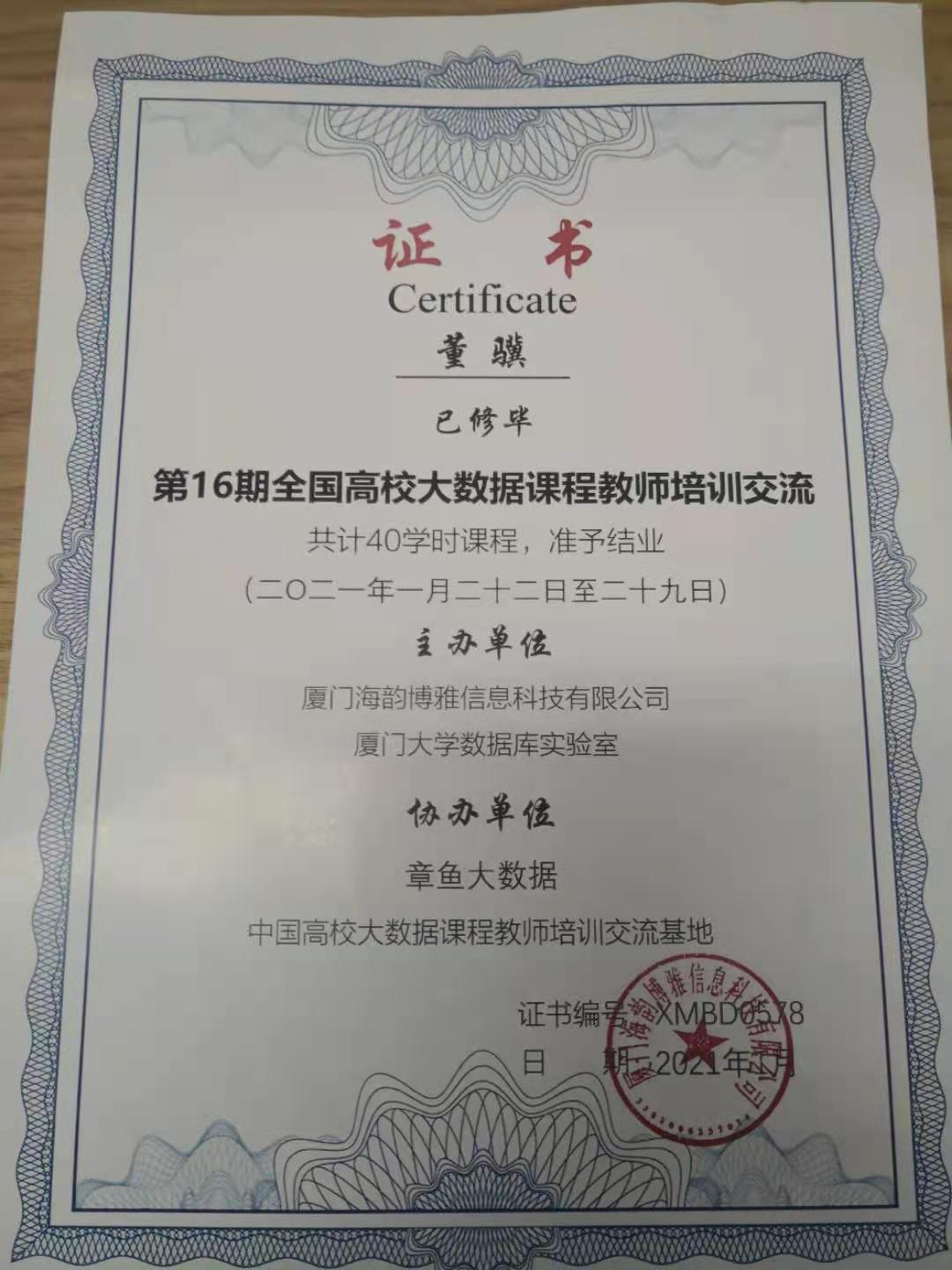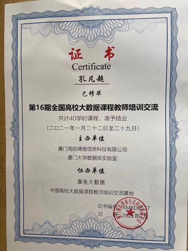 2021年1月22日至29日,由厦门海韵博雅信息科技有限公司联合章鱼大数据举办的“第16期全国高校大数据课程教师培训交流班(Hadoop+Spark综合班)”在厦门召开。本次培训交流班旨在为“加快中国高校大数据课程体系建设、促进中国高校大数据教学水平不断提升”做出积极贡献,邀请厦门大学云计算与大数据研究中心创始成员、高校大数据课程服务平台建设者、厦门大学计算机科学系副教授林子雨博士担任主讲教师。来自全国各大高等院校数据科学与大数据技术、计算机、软件工程等专业的科研、教学带头人,骨干教师参与了本次培训交流班。公司数据科学系青年教师孔凡超博士、董骥博士等参加了本次培训班。
