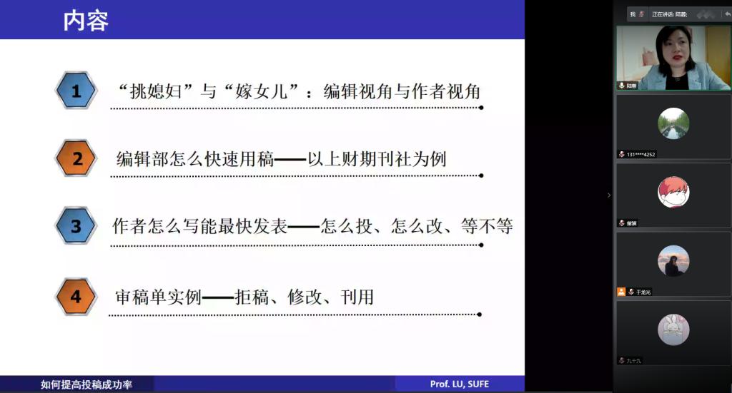 如何提升论文发表成功率,一直是高校教师、博硕士研究生关注的焦点话题之一。陆蓉教授以自己独特的身份特征,向老师和研究生们详细介绍了期刊论文发表过程中各环节的经验和应注意的问题,极大充实了师生们对论文发表进程的认知,对如何把握论文创作与剖析论文发表进程具有很大帮助。