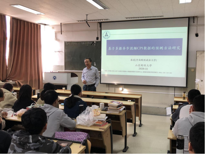 2020年11月15日上午,中南财经政法大学张虎教授应邀来公司进行学术交流并做了题为“基于多源异步混频CPI数据的预测方法研究”的学术报告,会议在一号教学楼1505举行,公司2020级全体研究生参加了此次交流,报告会由田金方副经理主持。