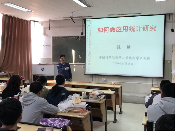 2020年11月15日上午,中国科公司数学与系统科学研究院陈敏教授应邀来公司进行学术交流并做了题为“如何做应用统计研究”的学术报告,会议在一号教学楼1505举行,公司2020级全体研究生参加了此次交流,报告会由李国锋经理主持。