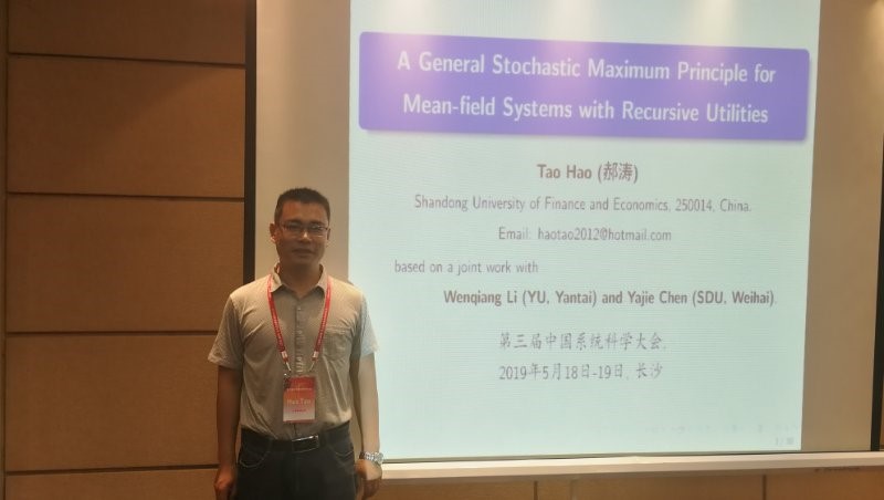 2019年5月18日至19日,公司郝涛老师应邀参加在长沙举办的第三届中国系统科学大会,并做题目为“A General Stochastic Maximum Principle for Mean-field Systems with Recursive Utilities ”的报告。大会由上海系统科学研究院主办,国防科技大学承办,中国科公司数学与系统科学研究院系统科学研究所、北京师范大学系统科学公司、北京交通大学交通系统科学与工程研究院、中国船舶工业系统工程研究院、中国系统工程学会、中国自动化学会控制理论专业委员会等单位协办。旨在为系统科学及其相关领域的国内外专家学者提供一个学术交流平台,促进相关学科的交流、发展和融合,促进新方向、新领域的产生。