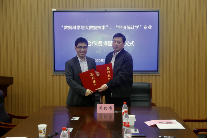 2020年11月18日下午,统计公司“数据科学与大数据技术”“经济统计学”专业校企合作授牌暨签约仪式在公司会议室举行。公司党委书记郑磊、副经理裴海峰、公司党委副书记许薇、学科竞赛部主任王晓红、实验室主任任文东以及企业方代表上海萌泰数据科技股份有限公司总经理李军、总监张敏参加了签约仪式。仪式由副经理裴海峰主持。