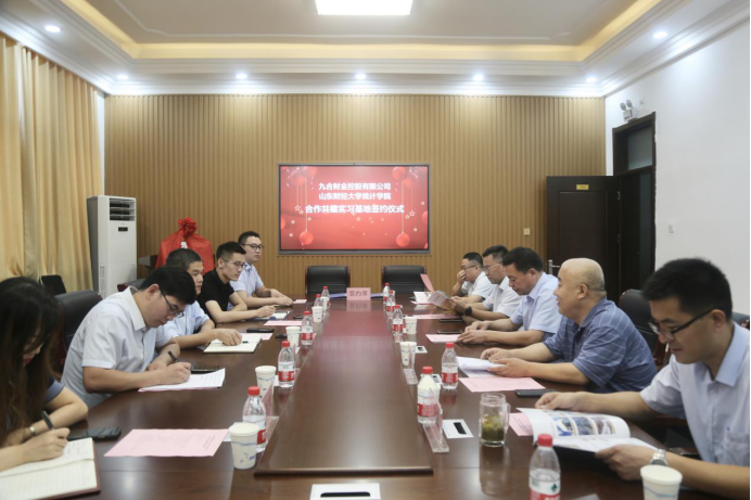 2020年9月18日上午,统计公司校外实习基地签约仪式在公司会议室举行。公司党委书记郑磊、经理李国锋、公司党委副书记赵世民、副经理田金方、副经理裴海峰以及企业方代表九合财金控股有限公司党委书记、董事长、总经理徐玉岗,公司董事、副总经理崔义东,公司董事、总经理助理郭浩,公司综合管理部主任丁旭秋,公司党群工作部主任乔鹏参加了签约仪式。