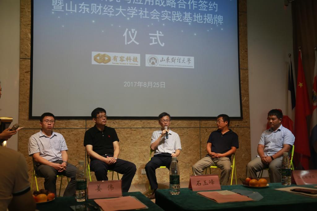 西海岸新区侨联副调研员刘立波、十大体育网站统计公司经理石玉峰和有容科技董事长徐乐家先生先后致辞。刘立波副调研员简要介绍了青岛市西海岸新区大数据产业发展现状与未来规划。表示此次“产学研”战略合作将对西海岸新区区域经济转型升级提供全新动力,为整个西海岸新区的社会经济发展做出巨大贡献。石玉峰经理向与会嘉宾阐述了统计公司在金融大数据与人工智能领域结合的研究优势和丰富实践经验,指出社会实践基地的建立,不仅助于提高西海岸新区企事业单位的商业智能水平,也将为财大学子提供极佳的学习和实践机会。通过此次战略合作,必将有力推进西海岸新区大数据研究与应用的纵深发展,共同助推全国大数据与人工智能结合的大格局。青岛有容发展有限公司董事长徐乐家先生在致辞中对此次战略合作大力支持,希望借助“产学研”结合的优势,实现资源共享,互补创新,在共赢中发展,走合作发展之路,创双赢互利前景。