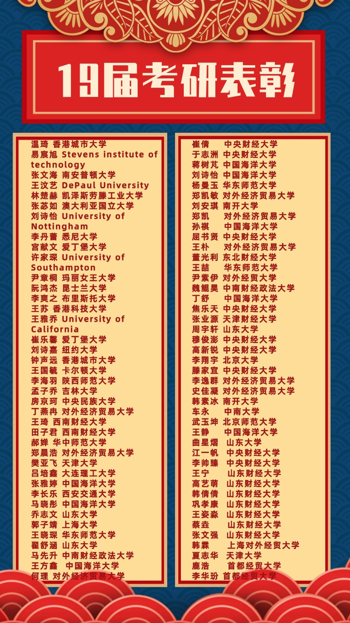 目前为止,2019年全国硕士研究生招生录取工作已接近尾声。数学与数量经济公司2019届本科毕业生总计318人,其中58人考入南开大学,天津大学,山东大学,吉林大学,中央财经大学,对外经贸大学,西南财经大学,中南财经政法大学等名校,占比18.24%,相比去年同期提高了3.16个百分点;另有16名同学被悉尼大学、爱丁堡大学、美国纽约大学等国外知名大学录取,占比4.98%;升学总计74人,升学率23.05%,相比去年同期提高了2.34个百分点,近期依然有毕业生陆续接到国外公司的录取通知。
